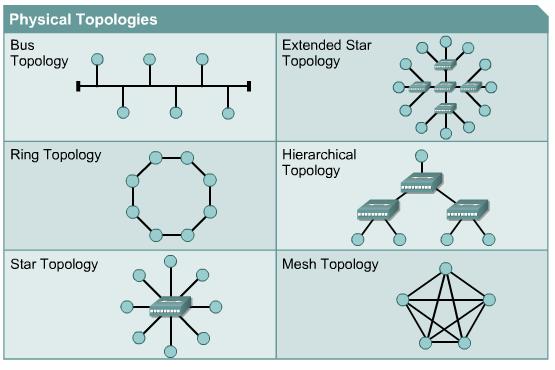 The physical topology of a network is the actual layout of the wire or media. The logical topology defines how host devices access the media. The physical topologies that are commonly used are bus, ring, star, extended star, hierarchical, and mesh. The two most common types of logical topologies are broadcast and token passing.