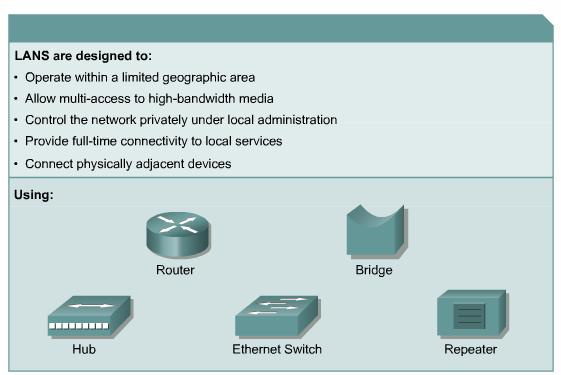 A local-area network (LAN) is designed to operate within a limited geographical area. LANs allow multi-access to high-bandwidth media, control the network privately under local administration, provide full-time connectivity to local services and connect physically adjacent devices.