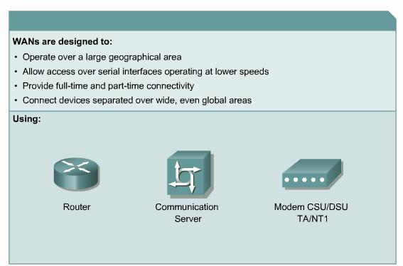 A wide-area network (WAN) is designed to operate over a large geographical area. WANs allow access over serial interfaces operating at lower speeds, provide full-time and part-time connectivity and connect devices separated over wide areas.