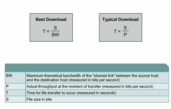 The amount of information that can flow through a network connection in a given period of time is referred to as bandwidth. Network bandwidth is typically measured in thousands of bits per second (kbps), millions of bits per second (Mbps), billions of bits per second (Gbps) and trillions of bits per second (Tbps). The theoretical bandwidth of a network is an important consideration in network design. If the theoretical bandwidth of a network connection is known, the formula T=S/BW (transfer time = size of file / bandwidth) can be used to calculate potential data transfer time. However the actual bandwidth, referred to as throughput, is affected by multiple factors such as network devices and topology being used, type of data, number of users, hardware and power conditions.