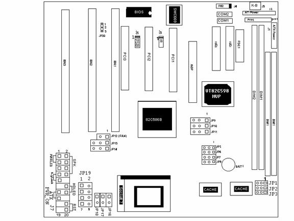 Chapter 2 Hardware design2-1 Mainboard LayoutThis mainboard is designed with VIA ApolloMVP3 AGP/PCIset chipset which is developed by VIA Corporation to fully support Pentium Processor PCI/ISA system . By providing a massive increase in the bandwidth available between the video card and the processor (66MHZ) , the unique feature of AGP supported by VIA Apollo MVP3 chipset improves the speed of rendering and texturing for 3D graphics. The chipset also provides an integrated IDE controller with two high Performance IDE interfaces for up to four IDE devices (hard devices , CD-ROM device , etc) .The SMSC37C669 Super I/O controller provides the standard PC I/O function: one floppy interfacd , two 16 Byte FIFO serial ports and one EPP/ECP capable parallel port . This mainboard layout is shown in the next page for user,s reference . care must be taken when inserting memory modules, CPUs or even plugging PCI card into associated slots to avoid damaging any circuits or sockets on board. A cooling fan is strongly recommended when installing Pentium/Pentium MMX/K5/K6/K6-2/K6-3/6x86/ 6x86L/ 6x86MX/C6 processor due to possible overheat .This mainboard supports a minimum of 8MB and a maximum of 512MBof system Memory while Onboard 512KB cache to increase system performance .