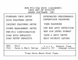 19 Soft-OFF(coming from this mainboard circuit controller) , it is another way to turn off your system . Your system can be shut down automatically by an operation system such as Windows 95 . 2-5 External Mode Ring-in Power ON Functions On The basts of bounded functions in I/O Chipset , the serial ports are able to Support the Extemal Modem Ring-in Power On function. Once user connect the Extemal modem to COM1 or COM2, this mainbard mainboard allows user to turn On their system through the remote and host,s dial-up control. Chapter 3 AWARD BIOS SETUP Award,s ROM BIOS provides a built-in setup program which allows user to modify the basic system configurations and hardware parameters . The modified data will be stored in a battery-backed CMOS RAM so that data will be retained even when the power is turned off .In general , the information saved in the CMOS RAM stays unchanged unless there is a configuration change in the system , such as a hard drive replacement or a new device installation . If this does happen , you will need to reconfigure your configuration parameter . To Enter Setup Program Power