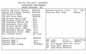 (PCI or ISA card)IDE connector. You have to set Onboard Primary PCI IDE, Disabled and Onboard Secondary PCI IDE: Disabled From CHIPSETF EATURESS ETUP UTILIIY. The Onboard PCI IDE cable should be equal to or less than 18 inches(45cm).IDE HDD Block Mode: The default value is Enabled. Enabled: Enabled IDE HDD Block Mode. The HDD transfer rate is better than Disable. Disabled: Disable IDE HDD Block Mode. l PCI Slot IDE 2nd Channel: The default value is Enabled. Enabled :Enable secondary IDE port and BIOS will assign IRQ15 for this port. Disabled :Disable secondary IDE port and IRQ15 is available for other device. l Onboard Primary PCI IDE: The default value is Enabled. Enabled :Enable Onboard 1 st channel IDE port. Disabled: Disable Onboard 1 st channel IDE port .When use On-card (PCI or ISA Card) IDE connector. l Onboard Secondary PCI IDE: The default value is Enabled. Enabled:Enable Onboard 2nd channel IDE port. Disabled :Disable Onboard 2nd channel IDE port When use On-card (PCI or ISA Card) IDE connector. l IDE Primary Master PIO:The default value is Auto. Auto :BIOS will automatically detect the Onboard Primary Master PCI IDE HDD Accessing mode. Mode0~4:Manually set the IDE Accessing mode. l IDE Primary Slave PIO:The default value is Auto.