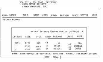 Note: To support LBA or LARGE mode of HDDs , there must be some softwares involved. All Softwares are located in the Award HDD Service Routine(1NT 13h). It may fail to accessA HDD with LBA (LARGE)mode selected if you are running under on Operating System Which replaces the whole 1NT13H.UNIX operating system do not support either LBA Or LARGE and must utilize the Standard mode.UNIX can