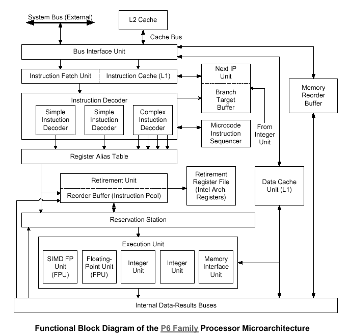 Dynamic Execution Technology can be summarized as optimally adjusting instruction execution by predicting program flow, having the ability to speculatively execute instructions in any order, and then analyzing the program’s dataflow graph to choose the best order to execute the instruction. The implementation of Dynamic Execution of the Pentium Pro processor are shown in the following block diagram including cache and memory interfaces. The 'Units' shown in the diagram represent stages of the Pentium Pro processor pipeline.