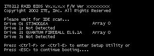 l Click the ¡§Esc¡¨ key to go back to the Main Menu on page 9. l Click the ¡§Esc¡¨ key to quit BIOS and boot. l You need to FDISK and format your new array. The new array will be regarded as a new hard drive by the system. Setup UtilityUsing the RAIDExpress 133 Card Setup UtilityThe RAIDExpress 133 card Setup Utility provides functions to create, delete and rebuild an array. It also provides the information of each hard drive and the configuration of the RAIDExpress 133 card. Please attach your hard drives to the RAIDExpress 133 card and boot your system. If your array¡¦s configuration is correct, you will see the following message shown by the RAIDExpress 133 card onboard BIOS on the screen. You can press ¡§Ctrl-F¡¨ or ¡§Ctrl-E¡¨ keys to enter Setup Utility or press the ¡§Esc¡¨ key to skip and boot directly.