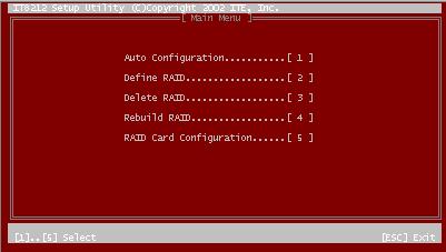 RAIDExpress 133 Card Setup Utility Main MenuThere are five options in the Setup Utility Main Menu, please press 1 ~ 5 to enter the submenu or the ¡§Esc¡¨ key to quit the Setup Utility.