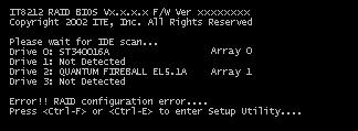 If your array¡¦s configuration is incorrect, you will see an error message on your screen. You have to enter Setup Utility to reconfigure the arrays then quit utility to boot.
