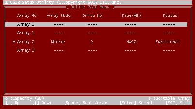 Define RAIDClick ¡§2¡¨ on the Main Menu then you can enter the Define RAID Menu. Please use arrow keys ¡ô and ¡õ to highlight the array number you want to define; use the ¡§space¡¨ key to specify the bootable array if you would like to boot your system from array attached on RAIDExpress 133 controller; and click the ¡§Enter¡¨ key to select it and enter the Define RAID Sub-Menu to create your array. If you want to quit and go back to the Main Menu, please click the ¡§Esc¡¨ key.