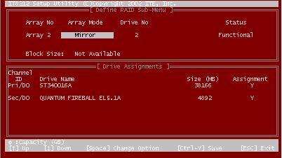 When an array is not assigned a RAID level, you will see ¡§ Please highlight the array number you want to define and click the ¡§Enter¡¨ key, then the Define RAID Sub-Menu will appear and allow drive assignments to the array. Define RAID Sub-Menu When you highlight the array you want to define on the Define RAID Menu, click the ¡§Enter¡¨ key then you will enter this Define RAID Sub-Menu. You can use arrow keys ¡ô and ¡õ to highlight different positions. The ¡§space¡¨ bar key can help you cycle through the different options. ¡§Ctrl-Y¡¨ keys can save the change and the ¡§Esc¡¨ key can help you quit then go back to the Define RAID Menu on page 21.