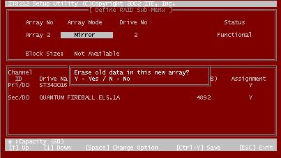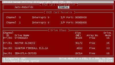 If you are not familiar with the array setting, please follow the procedures in Auto Configuration on page 16 to create new arrays automatically. You can use Define RAID on page 21 and Delete RAID on page 27 to manually create or delete arrays. You can also use Rebuild RAID selection on page 30 to help you rebuild a mirrored (RAID 1 or RAID 0+1) array. Besides, you can use RAID Card Configuration on page 35 to see the controller¡¦s resources, each hard drive¡¦s status and the setting of the RAIDExpress 133 card. Auto ConfigurationClick ¡§1¡¨ on the Main Menu to enter Auto Configuration. You can use arrow keys ¡÷ and ¡ö and the ¡§space¡¨ bar key to change your option. After selecting your option, you can press ¡§Ctrl-Y¡¨ keys to save the setting and click the ¡§Esc¡¨ key to leave Auto Configuration menu and go back to the Main Menu on page 15.