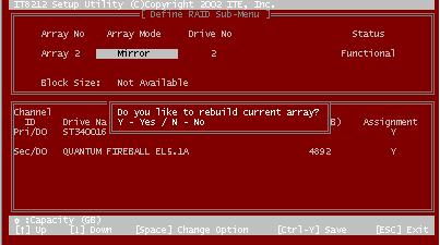 If your RAID Mode selection is Mirror or Stripe + Mirror and you choose not to delete the boot sector of the array, the following window will appear to ask whether you want to rebuild an array. If you choose ¡§Y¡¨, the Rebuild RAID Menu will appear. (Please refer to page 30.)