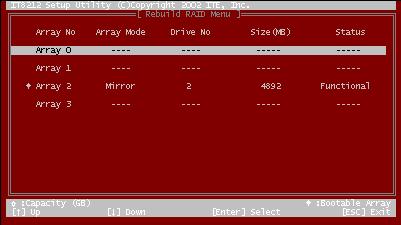 automatically. Rebuild RAIDPress ¡¨4¡¨ when you are at the Main Menu then the Rebuild RAID Menu will appear. You can use ¡ô and ¡õ keys to highlight different arrays, press the ¡§Enter¡¨ key to select an array and enter the next rebuild drive select screen. If the RAID Mode of the array you want to select is neither mirror nor stripe + mirror, the ¡§Enter¡¨ key will have no effect. If you want to leave and go back to the Main Menu, press the ¡§Esc¡¨ key.