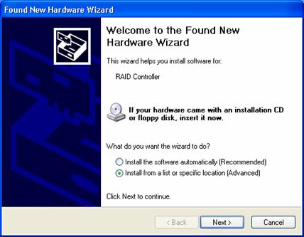 l Boot from floppy with Windows installation diskette. l Boot from floppy with un-installable diskette. l Boot from CD-ROM with Windows installation CD. 2. When the message ¡§Press F6 if you need to install third party SCSI or RAID driver¡¨ appears on the bottom of the screen, please press the <F6> key. 3. The installation will continue. When a message appears to ask you to designate the device you want to install, press the <S> key. 4. Follow the instruction of the installation program to insert the RAIDExpress 133 ATA RAID Controller Driver diskette into the floppy disk drive then press the <Enter> key to continue. 5. Select RAIDExpress 133 ATA RAID Controller (Windows 2000/XP) from the device list shown on the window then press the <Enter> key to continue. 6. The devices that are going to be installed will be listed on the next window. RAIDExpress 133 ATA RAID Controller (Windows 2000/XP) should be contained on the list. If you need to install any other devices, please designate them now. After designating all the devices, please proceed to the next step. 7. Press the <Enter> key to continue the installation of Windows XP. Install the driver under existing Windows XP 1. Start Windows. 2. When Windows detects RAIDExpress 133 ATA Raid Controller in the system, a dialog box named Found New Hardware Wizard will show on the screen. Select the Install from a list or specific location (Advanced) option then click ¡§Next¡¨ to continue to setup.