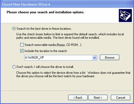 3. Insert the RAIDExpress 133 ATA Raid Controller Driver diskette into the floppy disk drive then check the Search for the best driver in these locations option and type A:\WIN2K_XP on the field designating the file¡¦s location. Press ¡§Next¡¨ to continue to setup.