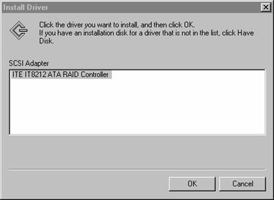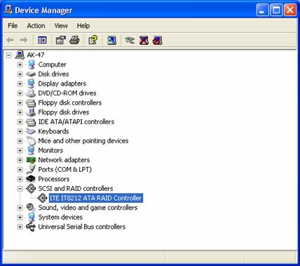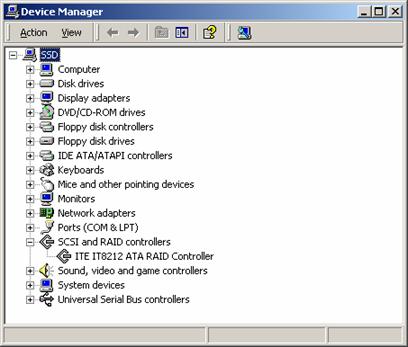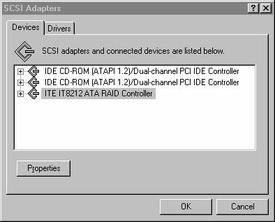 Verify Installation Follow the previous section to install the driver. After the system restarts, you can do the following steps to check if the driver has been installed successfully. 1. Follow step1 to step3 described in the previous section to activate the SCSI Adapters option. 2. If the RAIDExpress 133 ATA RAID Controller device is shown on the Devices panel as shown below, it means that the driver has been installed successfully.