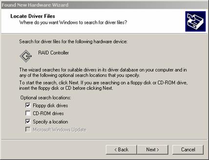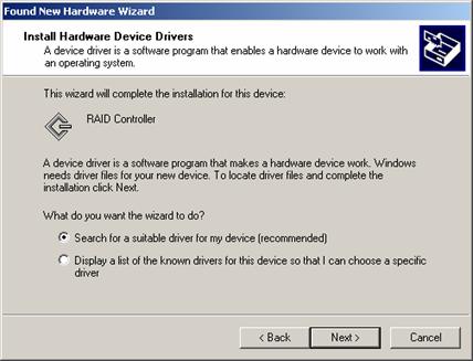 Boot from floppy with Windows installation diskette. Boot from floppy with un-installable diskette. Boot from CD-ROM with Windows installation CD. 2. When the message ¡§Press F6 if you need to install third party SCSI or RAID driver¡¨ appears on the bottom of the screen, please press the <F6> key. 3. The installation will continue. When a message appears to ask you to designate the device you want to install, press the <S> key. 4. Follow the instruction of the installation program to insert the RAIDExpress 133 ATA RAID Controller Driver diskette into the floppy disk drive then press the <Enter> key to continue. 5. Select RAIDExpress 133 ATA RAID Controller (Windows 2000/XP) from the device list shown on the window then press the <Enter> key to continue. 6. The devices that are going to be installed will be listed on the next window. RAIDExpress 133 ATA RAID Controller (Windows 2000/XP) should be contained on the list. If you need to install any other devices, please designate them now. After designating all the devices, please proceed to the next step. 7. Press the <Enter> key to continue the installation of Windows 2000. Install the driver under existing Windows 2000 1. Start Windows. 2. When Windows detects RAIDExpress 133 ATA Raid Controller in the system, a dialog box named Found New Hardware Wizard will show on the screen. Select the Search for a suitable driver for my device (recommended) option then click ¡§Next¡¨ to continue to setup.