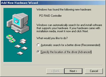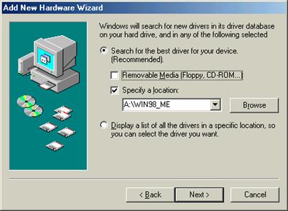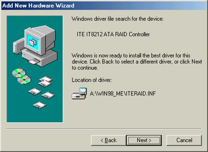 option then click ¡§Next¡¨ to continue to setup. 3. Insert the RAIDExpress 133 ATA Raid Controller Driver diskette into the floppy disk drive then select Search for the best driver for your device (Recommended) from the following dialog box and type A:\WIN98_ME on the field designating the file¡¦s location. Press ¡§Next¡¨ to continue to setup.