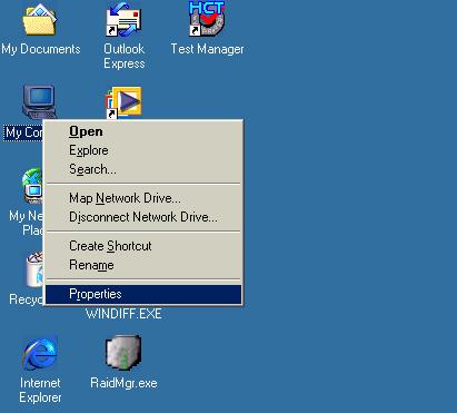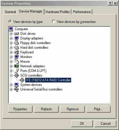 Verify Installation Follow the previous section to install the driver. After the system restarts, you can do the following steps to check if the driver has been installed successfully. 1. Right-click My Computer icon on Desktop. Select the Properties option from the form. 2. Select the Hardware tab from the System Properties window then click the Device Manager button on the panel. If RAIDExpress 133 ATA RAID Controller device is shown below the SCSI and RAID controllers item (see the following figure), it means that the driver has been installed successfully.
