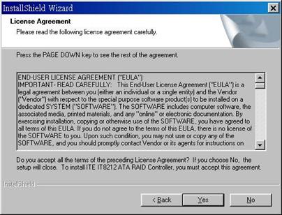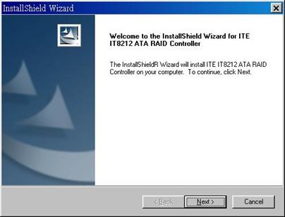 If you are using Lilo to boot your system, you also need to run lilo: # lilo Then reboot your system and the driver will be loaded. 3.1.5 Configure system to mount volumes during startup. Now you can inform the system to automatically mount the array by modifying the file /etc/fstab. E.g. You can add the following line to tell the system to mount /dev/sda1 to location /mnt/raid after startup: /dev/sda1 /mnt/raid ext2 defaults 0 0 3.2 Installing Red Hat Linux on IT8212 Controller. 3.2.1 Prepare your hardware for installation. After attaching your hard disks to IT8212 controller, you can use IT8212 BIOS to configure your hard disks as RAID 0, RAID 1, RAID 0/1 or JBOD arrays, or just use them as single disks. Remember to set the BOOT disk in the IT8212 BIOS configuration menu. Before installation, you must remove all the disk drives, which are not physically attached to IT8212 controller, from your system. 3.2.2 Check system BIOS setting. In your system bios setup menu, change Boot Sequence in such a way that system will first boot from CDROM, and then from SCSI. Refer to your BIOS manual to see how to set boot sequence. 3.2.3 Prepare the driver diskette. Copy all the files under /linux/driver/rh73/ directory to a new dos formatted disk. 3.2.4 Install Red Hat 7.3. l Start installing Red Hat 7.3 by booting with the CDROM. l On "welcome to Red Hat Linux 7.3!" installation screen, a prompted label "boot:" will appear at the bottom of the screen. Then type in "expert" and press enter. l Then you will be asked "Do you have a driver disk?". Select "Yes". l When "Insert your driver disk and press "OK" to continue" is prompted, insert the driver disk in the floppy driver and then select "OK". Then the IT8212 driver will be loaded. l Continue the installation as normal. You can refer to the Red Hat Linux installation guide. ApplicationInstallation1. Run iteraid.exe to install the device driver and the application. 2. Click ¡§Next¡¨ to start the installation.