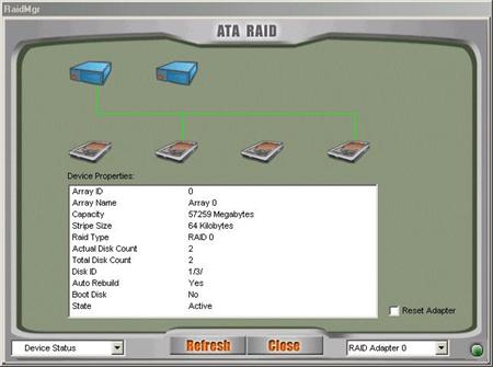 Note: Click the ¡§Start Menu¡¨ at the left bottom on the RAID Manager control panel to choose RAID functions. If more than one adapter exists, click the ¡§RAID Adapter¡¨ at the right bottom to choose RAID Adapter. Alert LED, at the right bottom, is used to indicate the whole system situation. GREEN: RED: If the configuration error of any array occurs. BLINKING: If there is any array in rebuilding process. 2. System Information Device Status Click the ¡§Start Menu¡¨ at the left bottom on the RAID Manager control panel then choose ¡§Device Status¡¨ to show the system information.