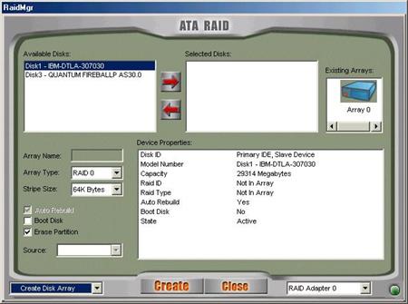2. Create RAID 1 l Open RAID Manager. l Change the control panel to ¡§Create Disks Array¡¨. l Select ¡§Array Type¡¨ as ¡§RAID 1¡¨. l Check ¡§Erase Partition¡¨ to erase partition table or uncheck ¡§Erase Partition¡¨ not to erase partition table. If there is an Array of RAID 1 or RAID 0+1, ¡§Erase Partition¡¨ can¡¦t be modified. l If ¡§Erase Partition¡¨ is unchecked, the ¡§Source¡¨ must be assigned. l Select exactly two disks (These two disks must be ¡§primary master and secondary master¡¨ or ¡§primary slave and secondary slave¡¨). l Click ¡§Create¡¨.