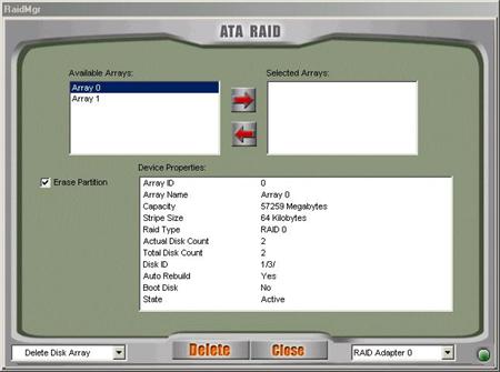 l Available Arrays: List existing arrays. l Selected Arrays: Arrays will be deleted. l Erase Partition: Check to erase partition table. l Click ¡§Delete¡¨ to delete disk arrays.