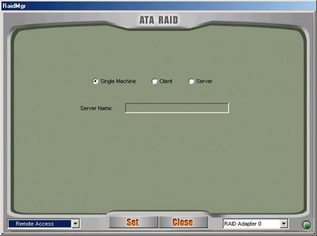 l Event Timer: Self error detection time interval. l Enable Email Notification: Check to enable email notification. l Email Address: If email notification is enabled, a warning message will be sent to this email box. l Select default mail tool or using SMTP protocol to send the mail. If SMTP protocol is selected, user must provide SMTP server and the email address of the sender. l Click ¡§Test¡¨ to send a test email to the above email address. l Click ¡§Set¡¨ to save the settings. Remote Access Click the ¡§Start Menu¡¨ at the left bottom on the RAID Manager control panel then choose ¡§Remote Access¡¨ to modify the settings.