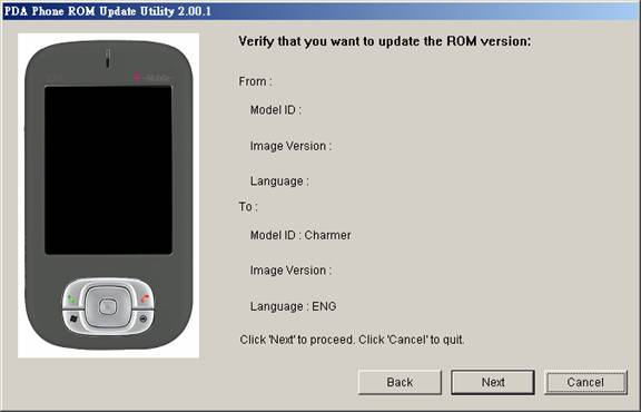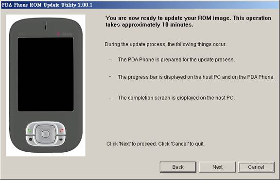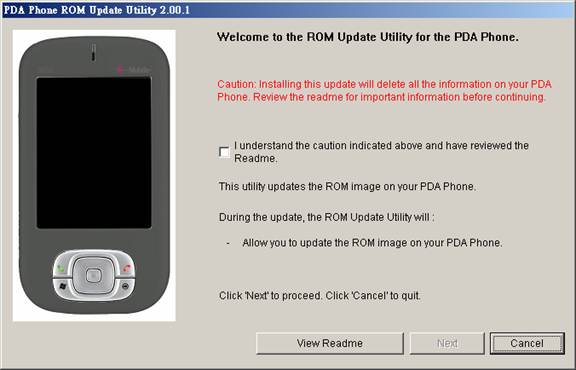 ROM Upgrade Utility (RUU)Before Running the ROM Upgrade UtilityBefore you run the ROM Upgrade Utility (RUU), make sure you check and do the following first: 1. USB sync cable is connected to the computer. 2. The power adapter is plugged to the phone. 3. The standby and hibernation modes are disabled on the computer. 4. All running applications on the computer have been closed. 5. USB sync cable is connected to the phone to establish an Ac 737g622h tiveSync connection with the computer. 6. Do not interact with your PDA Phone unless instructed to do so. 7. Do not remove the USB or power adapter from the PDA Phone. General Procedure on Installing the ROM Update1. Back up your personal data from the phone to your computer using ActiveSync if you want to ensure you don't lose any of your data. 2. On your computer, run the ROM Update Utility (RUU) to install the ROM update to your phone. (The next section provides a detailed procedure on how to install the ROM Update). 3. Restore your personal data back to your phone using ActiveSync. (Optional) How to Install the ROM UpdateIt is very important that the help desk personnel understands very well the installation instructions. Actual hands-on practice with the installation process is recommended for the personnel to better understand any installation problems users may have.Note: Before running the RUU, back up any personal data from the phone to the computer first using ActiveSync. 1. On the Welcome Screen, click Next to begin the ROM update installation.