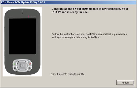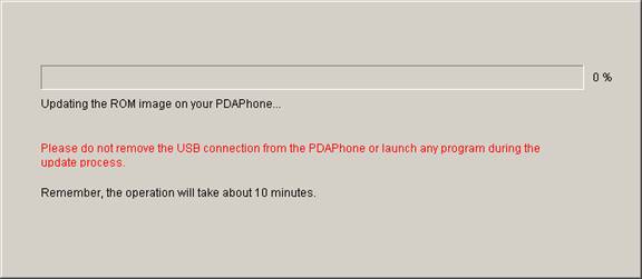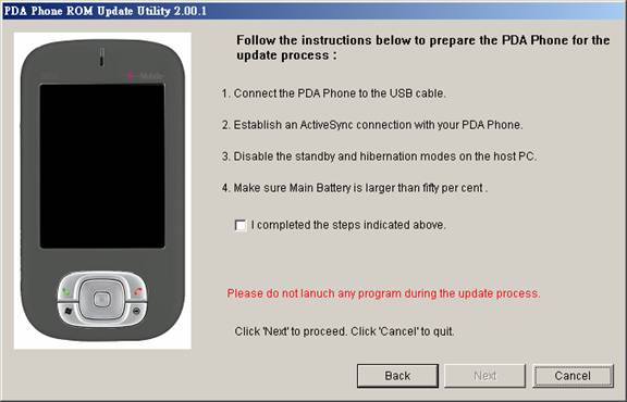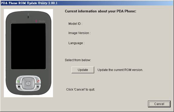 and cannot enter CE OS anymore, what should I do now? 1. Disconnect your PDA Phone from the USB cradle/cable. 2. Reset your PDA Phone. 3. Reconnect your PDA Phone to the USB cradle/cable. 4. Check that the communication cradle/cable is connected properly. 5. Return to the ROM Update Utility. Note: You should ignore the ActiveSync connection.