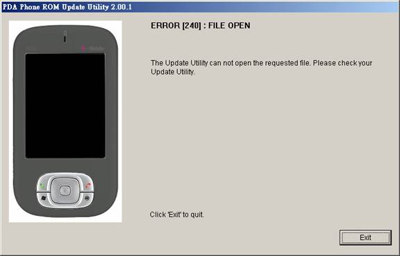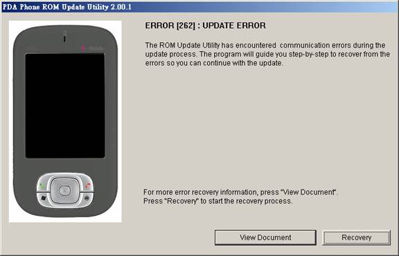 Troubleshooting and Error RecoveryAlmost all RUU related errors can be recovered. When an error occurs, the utility will display an error message and provide recovery measures to allow you to continue with the update process. After errors are recovered, do the following to continue with the update process: 1. Disconnect the PDA Phone from the USB cradle/cable. 2. Reset the PDA Phone. 3. Reconnect the PDA Phone to the USB cradle/cable. 4. Check that the communication cradle/cable is connected properly. 5. Return to the ROM Update Utility to continue with the update. If errors cannot be recovered, please refer to Q&A section for more details. u ERROR [202, 204] : CONNECTION This error message will appear when the device is not connected to ActiveSync correctly. Make sure you properly connect the device to the PC through ActiveSync before running RUU.