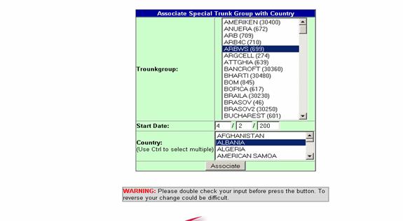 From here you select "Associate Special Trunk Group with Country" from the rate sheet options. This will take you to a screen where you can associate any destinations you want, to a certain carrier.