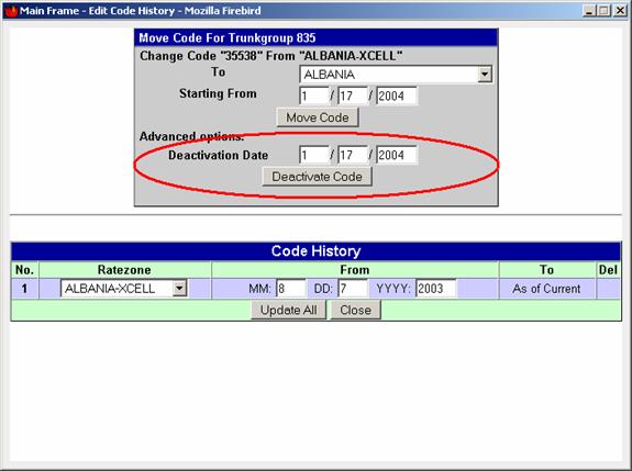 To deactivate a code, you must click on the code from the Code View for the corresponding carrier (this assuming that the code it's active!). Codes being active can be seen in the upper part of the table, they have in the left side, on the first colon written the destination name or special (special is for those codes that are in special rate zones).