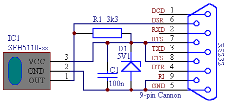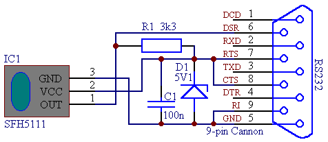 Integrated circuit is supplied directly from computer serial port - from pin RTS. Stabilization of voltage to 5V makes Zener diode D1. It is without limiting resistor, because it used fact, that serial port has current limiting cca 10mA. In first version was used limiting resistor, but there was problem with insufficient voltage in case of notebooks using. In notebooks are signal levels about +/-6V and voltage loss on resistor causes receiving unreliability (same reason is impossibility to use stabilization with circuits of type 7805, which have min. voltage loss about 2V).