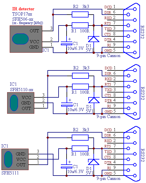Capacitor C1 is for filtration (flow peaks). Resistor R1 is pull-up according to recommendation of manufacturer of TSOP17xx. Output of receiver is connected to signal DSR of serial port, where is software decoded.