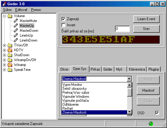 Service driver is designed as plug-in module "IgorPlug.dll" in program Girder, to which it send received code. Girder in the next executes function, which was choosed. Assigning of transmitted code to given action is going through so-called learning by following: In program Girder we create given action and then we push button "Learn Event" (see figure). In the next we push button on IR-control, transmitted code is received and assign to given action. Functionality of action we test by pushing the same button on remote control.