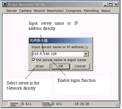 After set the server, return to main interface as figure 32. Select the server want to land in the drop down menu, click "OK". It will pop up a dialog box as figure 34 after many seconds. Input user name and password provided by server port, click "OK" to logon server and to monitor remote image.