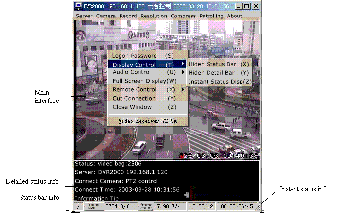 Enable "display status bar", it will add a bar with " frame size", "frame count", and a status bar with current time and surveillance time in the bottom of main interface.