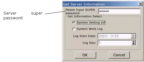 Input the super password, click "OK", then you can set the remote system in the system setting box that pop up after seconds. Please refer to "user guider" to see setting details. If you want to get the server's log, please click "OK" after affirming the start date and day of log you want to view, wait for seconds to view the detailed log information by linking to network successful.