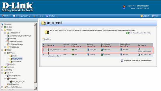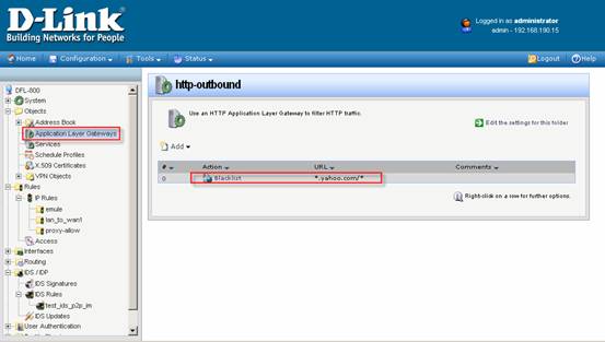 First, go to "Application Layer Gateways" "http-outbound", and create an URL blacklist shown as below, here we use yahoo.com as the example:
