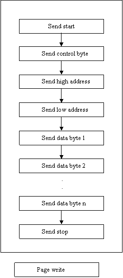 If large amounts of data had to be transferred this way then the protocol would be very slow. Fortunately the EEPROM has an on-chip page buffer, where the data is temporarily stored until the stop bit is received, and an internal address pointer. Upon initial receipt of a data byte, six low address bits are internally stored in the EEPROMs internal address pointer. The internal address pointer is incremented by one on the receipt of data. Page writes (figure 5) are limited to the size of the page within the EEPROM. The page in the 24FC256 is 64 bytes long and any attempt to cross the page boundary, regardless of the number of bytes written, will cause the address counter to roll over and overwrite data at the beginning of the page. Care, therefore, should be taken that no more than 64 bytes are sent or that a page boundary is not crossed before the 'stop' is generated. Physical page boundaries start at addresses that are integer multiples of the page buffer i.e. 0 - 3F16 and 4016 - 7F16 etc. Starting a page write at 7C16 would cross a page boundary after 4 bytes had been written. This would reset the internal address pointer to the start of the page at 4016 and carries on incrementing the internal address pointer with each new byte. The protocol for the page writes is as follows The 'start' followed by the control and the high and low address bytes then the data bytes are sent. The table write differs from the single byte write in that a 'stop' is not issued after the first byte is sent. The data bytes follow one after another until up to 64 bytes are sent and then the 'stop' is issued.