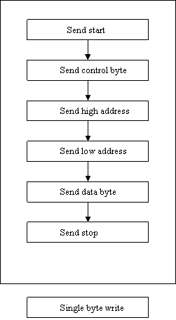 The first 'read' operation to be considered is the single byte write (figure 4). The sequence is started by the start bit. Following the start bit comes the control bit, which stipulates which EEPROM is being accessed and that a write operation is being carried out If, for example chip 6 is to be written to then the control byte will be 10101100. 1010 for device select, 1 10 for chip 6 and 0 for the write operation. If the slave has received this data correctly then it will issue an ACKnowledge by pulling the data line low. Following the control byte is the high address then the low address then the data byte and finally a 'stop' bit. This initiates the internal write cycle, which takes 5ms for byte or page. During this write time the EEPROM will not ACK signals. To prevent data being sent before the internal write cycle has been completed, the code has a delay loop at the end of the stop bit routine. This delays the master from transmitting any data or clock pulses until the slave is ready. A more efficient way of checking if the internal write cycle has finished is to use acknowledge polling. This involves sending a start bit and a control byte and detecting if an ACK is sent. If no ACK is received then the internal write is still being carried out. The start bit and control byte are repeatedly sent until an ACK is received