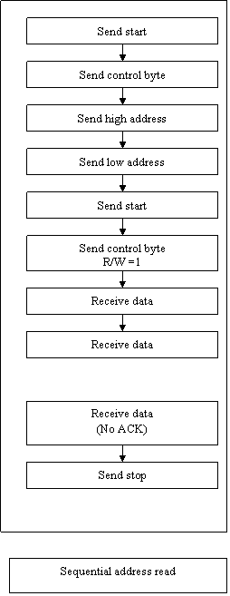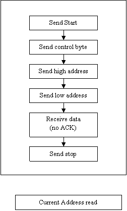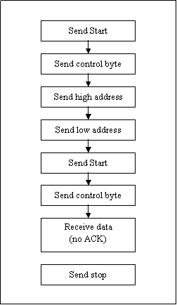 The next 'read' command, is the 'random address read' (figure 7). This routine allows the master to access any single memory location in the EEPROM. The routine starts similar to the 'single byte write'; the start bit, the command bit, and then the high and low address are sent. Then things change. The start bit is resent followed by the same control byte as before but with the R/W bit set to read. The slave then sends the read data on the data line. Again the master does not ACKnowledge the data, but sends the stop bit.