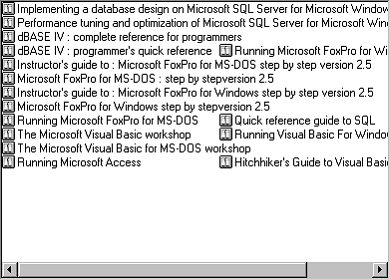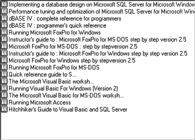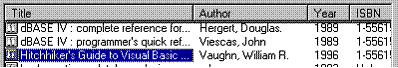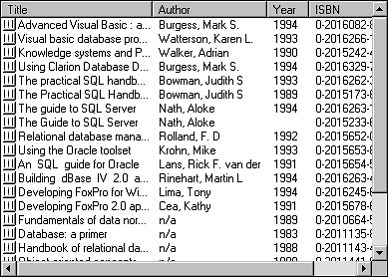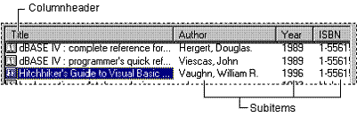Notice that in any of the views except Report view, the ListItem object displays only one label — the Text property. But in Report view, every ListItem object can have several other text items. For example, in Figure 2.11, the "Hitchhiker's Guide to Visual Basic…" also has an author ("Vaughn, William R."), year (1996), and ISBN number associated with it. Each of these text items are properties of the ListItem object, specifically, its SubItems property. Further, because there can be any number of these text items, the SubItems property is in fact an array of strings. Thus, to set the author, year and ISBN number of a ListItem object, the code might look like this: