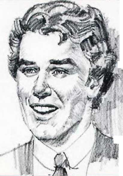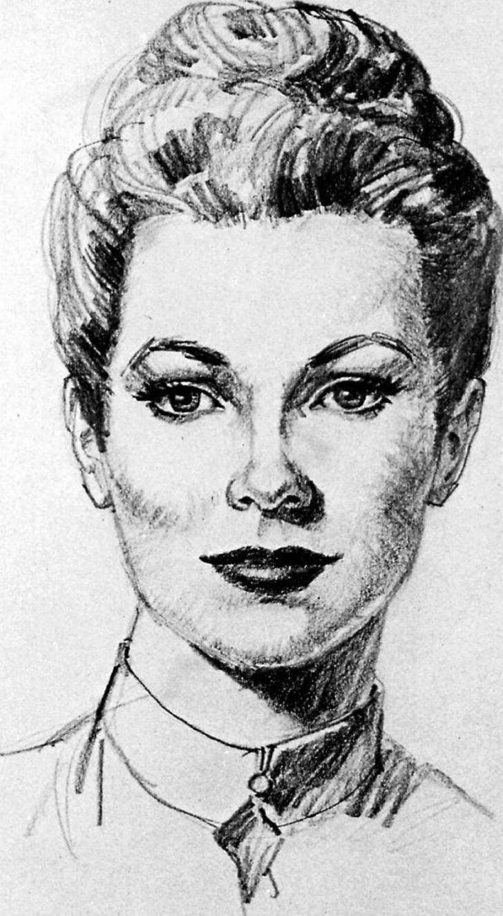 Step 3, With the point of the thick pencil, th artist now defines the shapes of the head and features more exactly. He redraws ihe con lours of the cheeks, jaw, chin, and neck directly over the original guidelines of Steps 1 and 2. The pencil point carefully traces the hairline. Then the artisi focuses on the features; he sharpens the contours of the eyebrows and draws the upper and lower lids; defines the shapes of the nostrils and the tip of the nose; constructs the planes of the lips; and emphasizes small, significant details such as the corners of the eyes, the coiners of the lips, and the cleft in the chin. Finally, he draws the irregular curves of the collar,