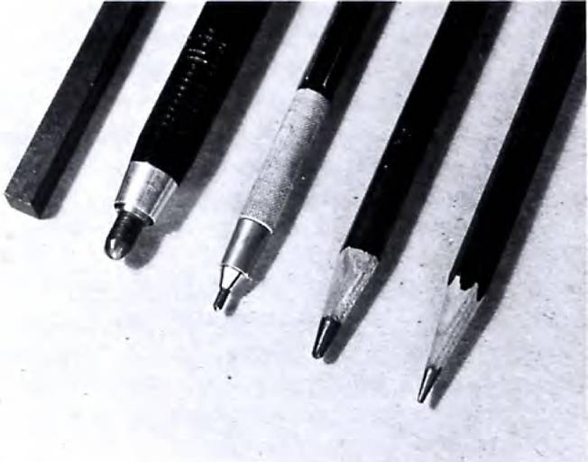Pencils. The common graphite pencil comes in many forms. Looking from right to left, you see the all-purpose HB pencil; a thicker, softer pencil that makes a broader, blacker mark; a metal holder that grips a slender, cylindrical lead; a plastic holder that grips a thick lead; and finally a rectangular stick of graphite that makes a broad, bold mark on the paper. 11*5 worthwhile to buy some pencils as well as two or three different types of holders to see which ones feel most comfortable in your hand.
