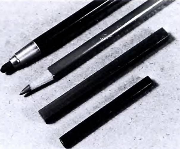 Pencils. When we talk about pencil drawing, we usually mean graphite pencil. This is usually a cylindrical stick of black, slightly slippery graphite surrounded by a thicker cylinder of wood. Artists' pencils are divided roughly into two groupings: soft and hard. A soft pencil will make a darker line than a hard pencil. Soft pencils are usually marked B, plus a number to indicate the degree of softness-3B is softer and blacker than 2B, Hard pencils arc marked H and the numbers work the same way-3H is harder and makes a paler line than 2H. HB is considered an all-purpose pencil because it falls midway between hard and soft. Most artists use more soft pencils than hard pencils. When you're ready to experiment with a variety of pencils, buy a full range of soft ones from HB to 6B + You can also buy cylindrical graphite sticks in various thicknesses to fit into metal or plastic holders. And if you'd like to work with broad strokes, you can get rectangular graphite sticks about as long as your index finger.