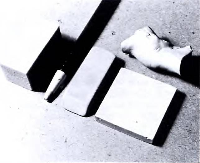Erasers (Rubbers). From left to right, you see the common soap eraser, best for cleaning broad areas of bare paper; a harder, pink eraser in pencil form for making precise corrections in small areas of graphite-pencil drawings; a bigger pink eraser with wedge-shaped ends for making broader corrections; and a square of kneaded rubber {putty rubber) that's best for chalk and charcoal drawing. Kneaded rubber squashes like clay (as you see in the upper right) and can take any shape you want. Press the kneaded rubber down on the paper and pull away; scrub only when neces-sary,