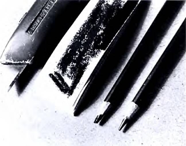 Knife and Sandpaper Pad, The pencil at the right has been shaped to a point with a mechanical pencil sharpener. The other pencil has been shaped to a broader point with a knife and sandpaper. The knife is used to cut away the wood without cutting away much of the lead. Then the pencil point is rubbed on the sandpaper to give it a broad, flat tip. Buy a knife with a retractable blade that's safe to carry. To the right of the knife you see a sandpaper pad that you can buy in most art-supply stores; it's like a small book, bound at one end so you can tear off the graphite-coated pages.
