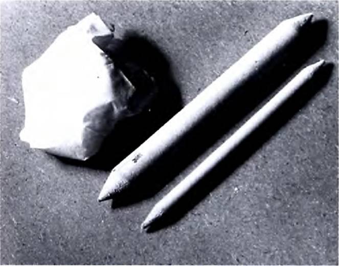 Stomps and Cleansing Tissue. To blend charcoal and push the blended tones into tight corners, you can buy stomps of various sizes in any good art-supply store. A stomp is made of tightly rolled paper with a tapered end and a sharp point. Use the tapered part for blending broad areas and the tip for blending smaller areas, A crumpled cleansing tissue can be used to dust off unsatisfactory areas of a drawing in natural charcoal. (It's harder, however, to dust off the mark of a charcoal pencil.) You can also use the tissue to spread soft tones over large areas.